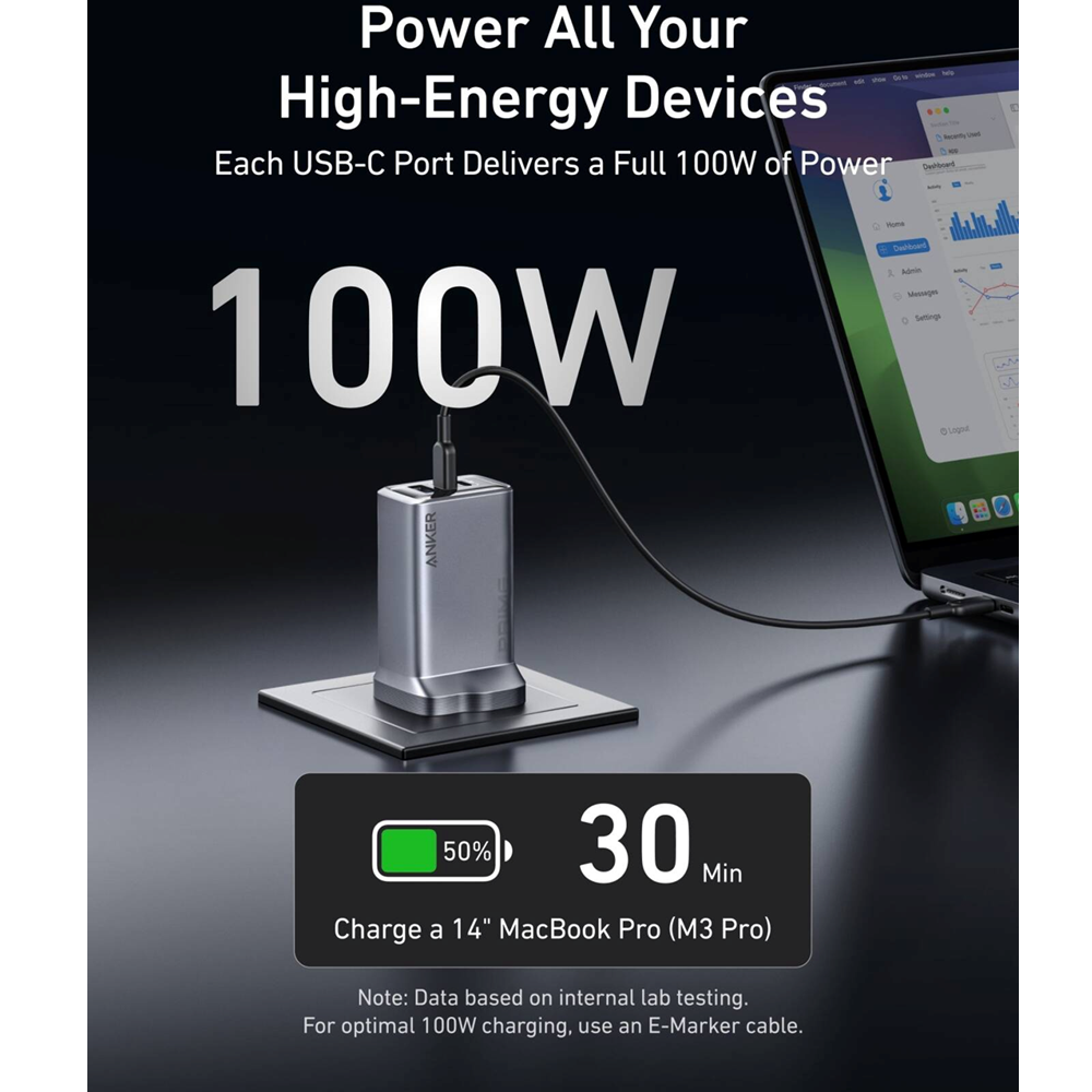 Each USB-C port delivers a full 100W, efficiently charging your 14-inch MacBook Pro (M3 Pro) from 0 to 50% in just 30 minutes.